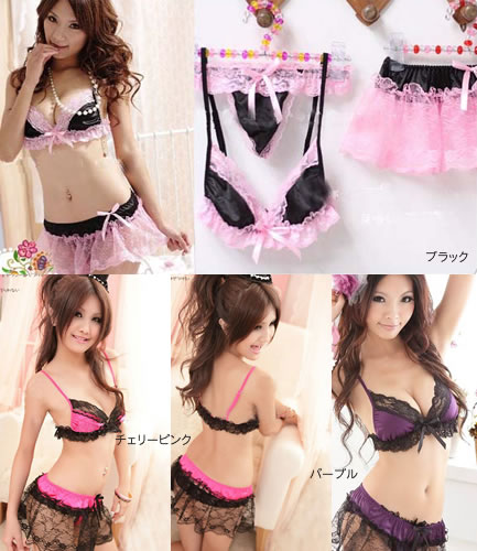 フリフリレースとサテンのブラジャー・ショーツ・スカート3点セット